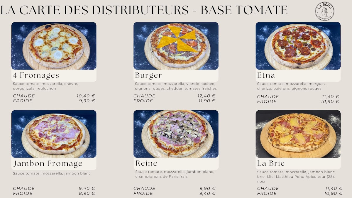 Distributeur de pizzas La Roma redefines convenience without sacrificing flavor. Nestled in Fontaine-la-Guyon, this innovative pizza distributor offers a diverse menu featuring both crème fraîche and tomato-based bases. Highlights include the rich Ch'ti with lardons and maroilles, the smoky Saumon Boursin, and the hearty Campagnarde loaded with fresh mushrooms and mustard. For tomato lovers, the 4 Fromages boasts a gourmet blend of goat cheese, gorgonzola, and reblochon, while the spicy Etna brings a fiery mix of merguez and chorizo.